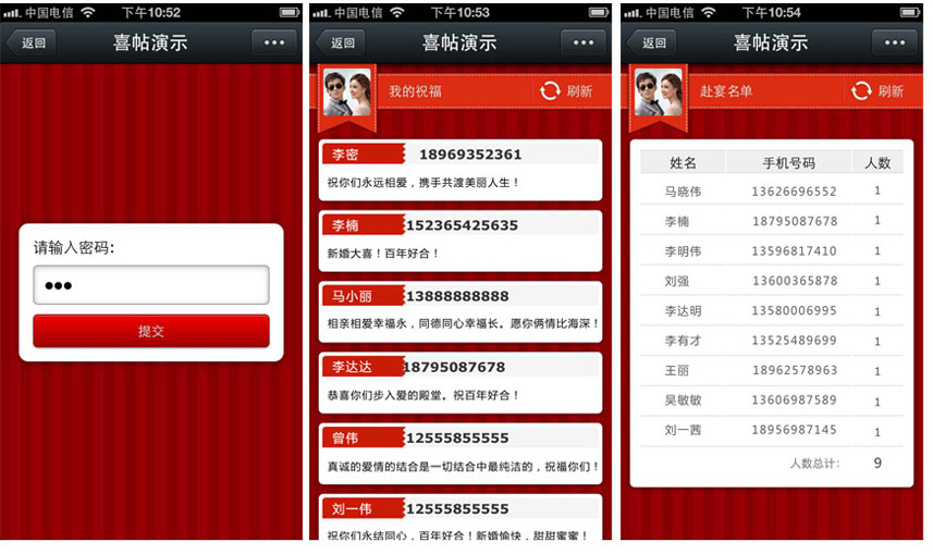 微喜帖是针对结婚庆典而推出的一款行业产品,主要是为计划结婚的用户们,通过使用微喜帖应用来向亲朋好友传播自己即将结婚的动态,可以展现用户想要表达的话、结婚日期、地址、导航、接待电话,同时亲朋好友可以在微喜帖平台上提交赴宴通知、送上祝福,并且转发喜帖。